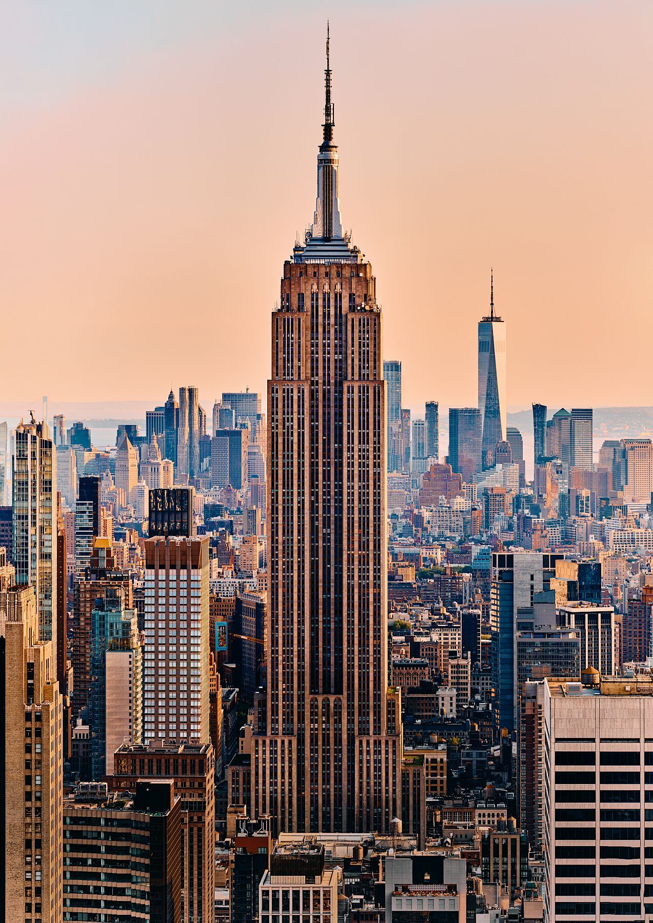 Behold the eternal splendor of the Empire State Building bathed in the warm embrace of a sunset with this captivating 100-megapixel panorama photo print.